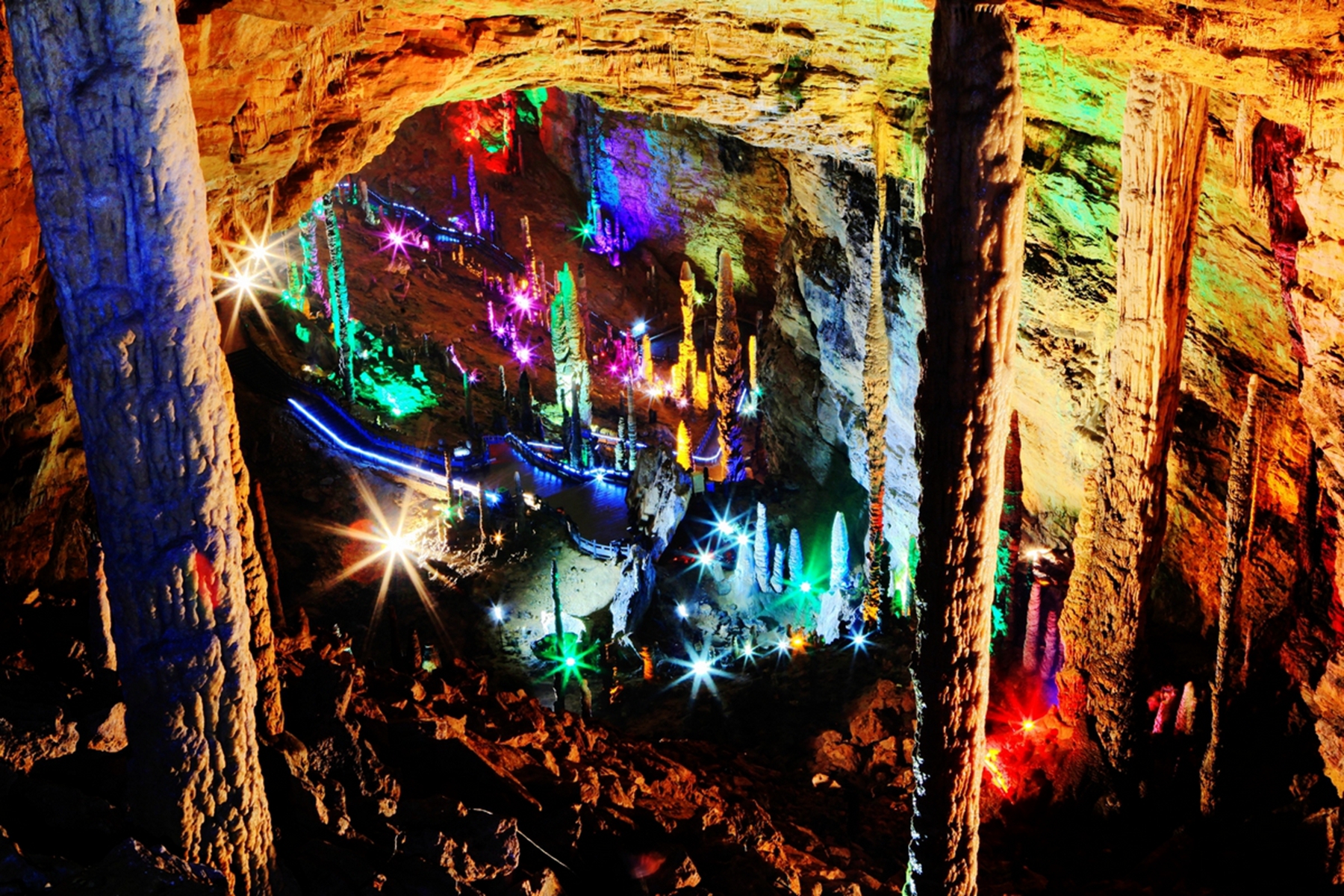 黃龍洞于1984年正式對(duì)外開放,現(xiàn)已探明的洞底總面積達(dá)10萬平方米,全長7.5公里,垂直高度140米,上下共分四層。其規(guī)模之大、鐘乳石之多、形狀之奇,在國內(nèi)外溶洞中極為罕見,被中外溶洞專家贊譽(yù)為世界溶洞的"全能冠軍"。